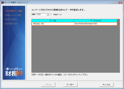KPC財務会計4データコンバートプログラムを起動します。KPC財務会計4がインストールされているドライブを選択し、コンバートを行うデータを選択して「次へ」をクリックします。 ※データコンバートプログラムは評価版をインストールすると、デスクトップにショートカットアイコンが作成されます。アイコンをダブルクリックして起動してください。 |