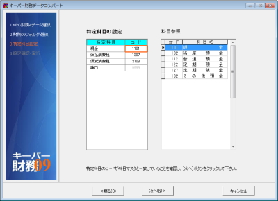 B | 「現金」「仮払消費税」「仮受消費税」の特定科目コードの設定を行います。設定してある科目コードと同じコードにして「次へ」をクリックします。 ※科目参照欄で科目コードを確認できます。 |