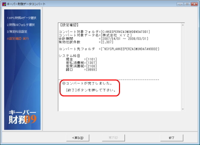 D | 完了のメッセージが表示したらコンバート終了です。「終了」ボタンをクリックし、コンバートプログラムを終了します。 | |