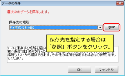 データの保存画面が表示します。「保存先の場所」欄には前回保存時の場所が表示していますが、変更する場合は「参照」ボタンをクリックします。 |