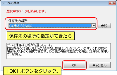 D | 「保存先の場所」の指定ができたら、「OK」ボタンをクリックします。データ選択画面に戻れば保存完了となります。 | |