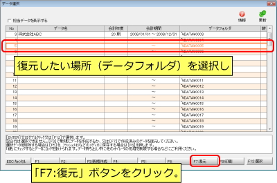 A | 復元したい場所を選択し、「F7:復元」ボタンをクリックします。 | |