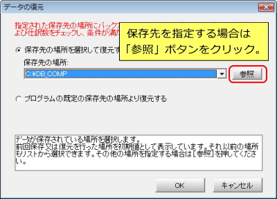 B | データの復元画面が表示します。「保存先の場所を選択して復元する」で復元をする場合は、「保存先の場所」欄に前回保存時の場所が表示していますが、変更する場合は「参照」ボタンをクリックします。 ※「プログラムの既定の保存先の場所より復元する」というのは、【拡張機能】にある「仕訳の全削除」「仕訳のインポート」「仕訳残高修復」を実行する前に、自動的にバックアップされたデータを復元する場合に選択します。 |