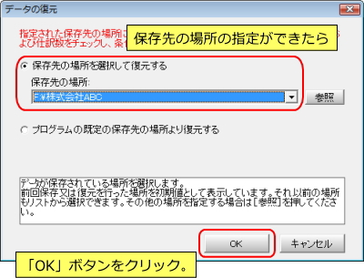 D | 「保存先の場所」の指定ができたら、「OK」ボタンをクリックします。データ選択画面に戻れば復元完了となります。 | |