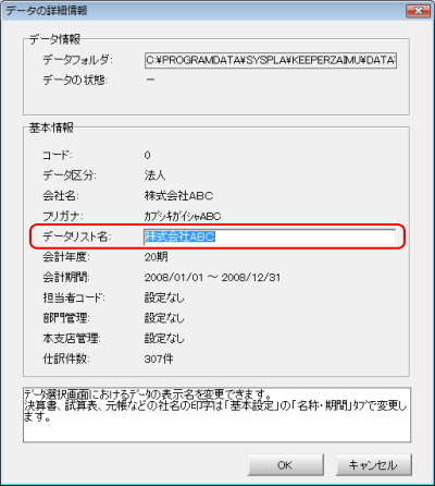 データの詳細情報画面が表示します。データリスト名欄でデータ名を変更し、「OK」ボタンを押すと変更完了となります。 |
