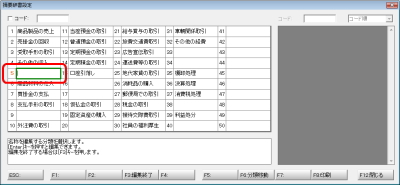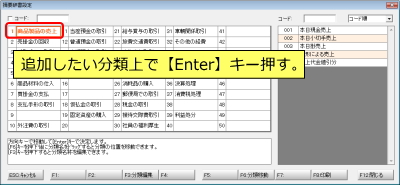 【拡張機能】−【摘要辞書設定】を開き、摘要を追加したい分類を選択後【Enter】キーを押します。 ※または画面右側の摘要リスト上をクリックします。 |
