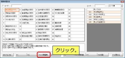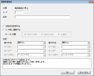 C | 入力した摘要が摘要辞書に追加されます。 ※コードは空欄で登録されます。必要に応じてコードを設定します。 |
