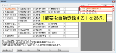 @ | 仕訳入力時に摘要辞書が表示したら、摘要を追加したい分類の中で「摘要を自動登録する」を選択します。 | |
