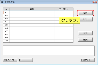コード体系を登録したいデータを選択後、【拡張機能】−【コード体系登録】を開き、「登録」ボタンをクリックします。 | |