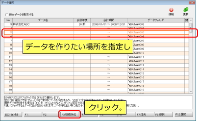 C | 次に【ファイル】−【データ選択を開く】を選びデータ選択画面を開きます。データを新規に作成したい場所を指定し、「F3:新規作成」ボタンをクリックします。 | |