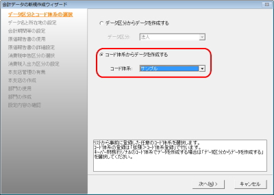 D | 会計データの新規作成ウィザードが表示します。最初の画面で「コード体系からデータを作成する」を選択し、リストから登録済みのコード体系を選びます。その後は画面の指示に従い新規作成ウィザードを完了すれば、指定したコード体系でデータが作成されます。 | |