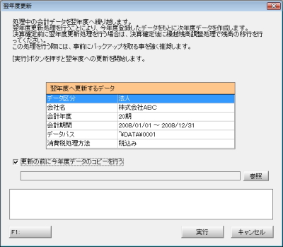 決算処理中データのコピーをした上で、【決算処理】−【翌年度更新】を行えばできます。キーパー財務09では、翌年度更新画面で、データコピーの指定ができるようになっております。 |