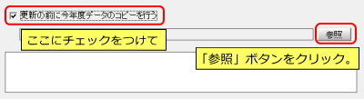 「更新の前に今年度データのコピーを行う」にチェックが入っているのを確認し、「参照」ボタンをクリックします。 | |