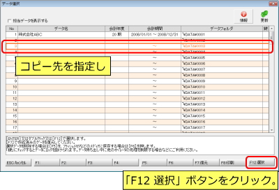 データ選択画面が表示するので、今年度データのコピー先を指定し、「F12:選択」ボタンをクリックします。 |