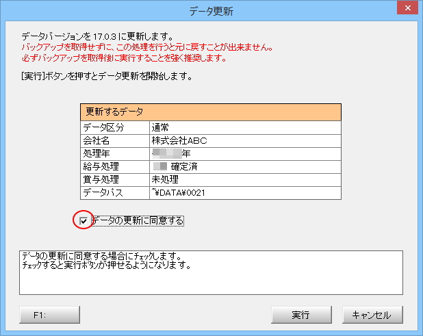 | 17. | データ更新画面が開いた場合は「データの更新に同意する」にチェックして「実行」をクリックします。 確認画面では「はい」をクリックして、そのまま暫くお待ちください。