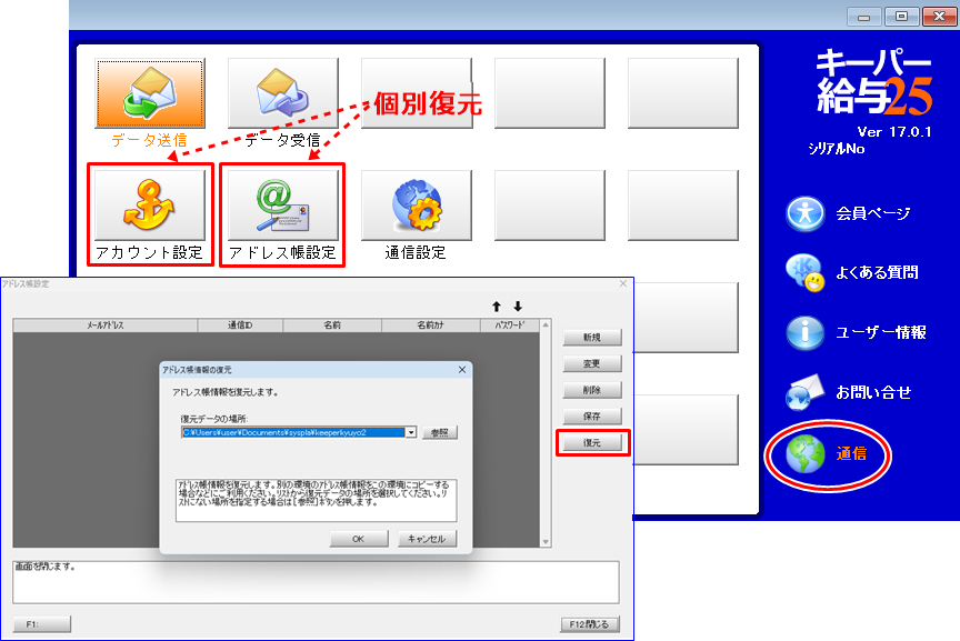 【アカウント設定】【アドレス帳設定】のデータをUSBメモリ等から復元します。