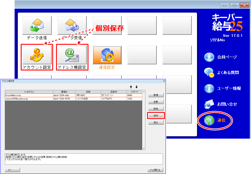 【アカウント設定】【アドレス帳設定】のデータをUSBメモリ等にバックアップします。