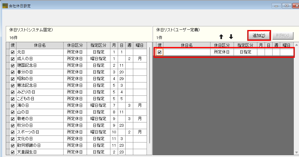手動での休日追加が必要となります。