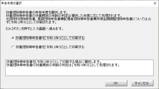 扶養親族の年齢の判定は選択した年度に応じて処理されます。※ 保険料控除申告書、基礎控除申告書兼配偶者控除等申告書兼所得金額調整控除申告書については必ず当年分として印刷されます。 - OK