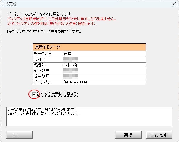 データ更新画面が開いた場合は「データの更新に同意する」にチェックして「実行」をクリックします。