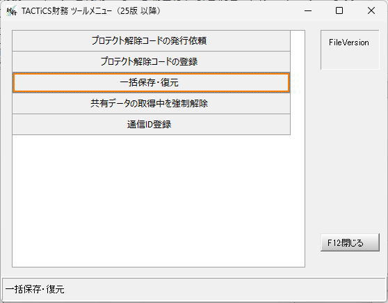 ツールメニューが開いたら「一括保存・復元」をクリックします。 |